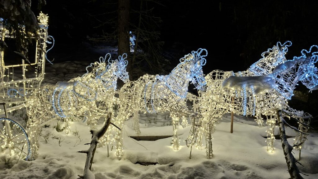 Nastavljamo Stazom vilenjaka, dugom 2,5 kilometra, gdje se stvarnost i mašta isprepliću. Oni koji žele mogu taj dio puta prijeći konjskom zapregom, dok ostali polako upijaju svaki detalj: božićni labirint, tople stanice s čajem i kuhanim vinom te romantičnu svjetleću šumu koja obasjava snježne grane i stvara nezaboravnu atmosferu.