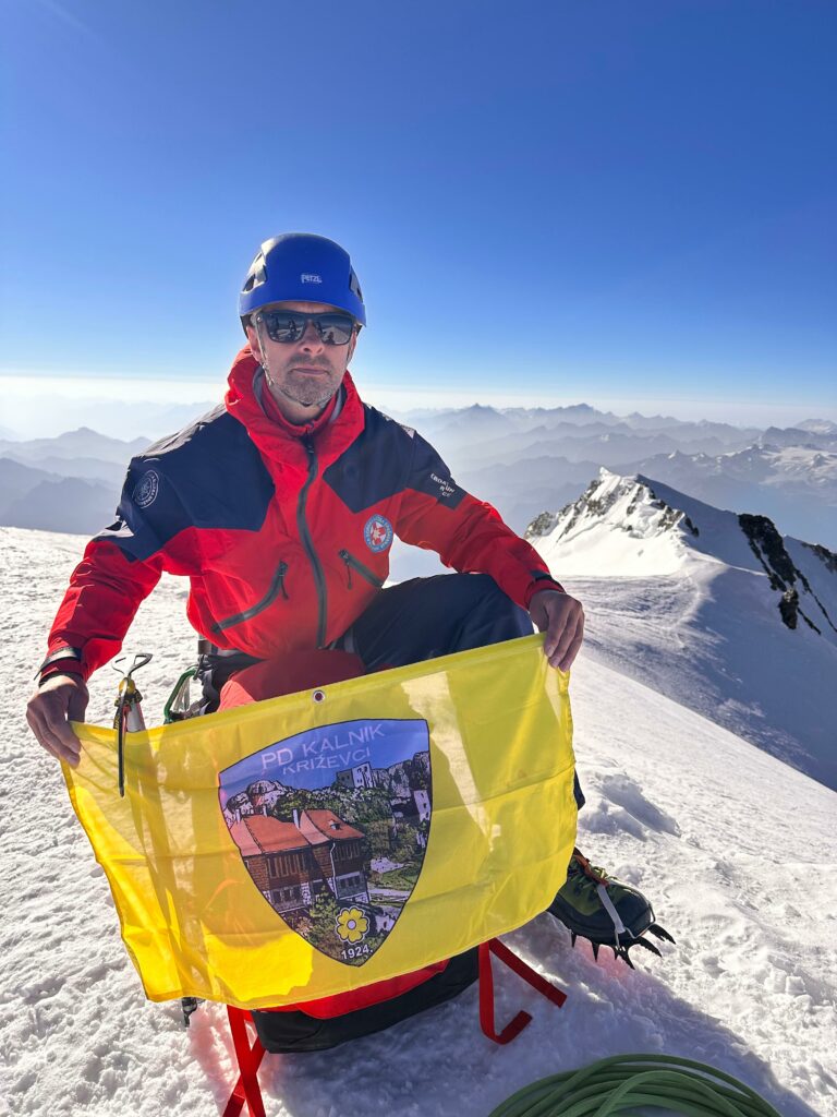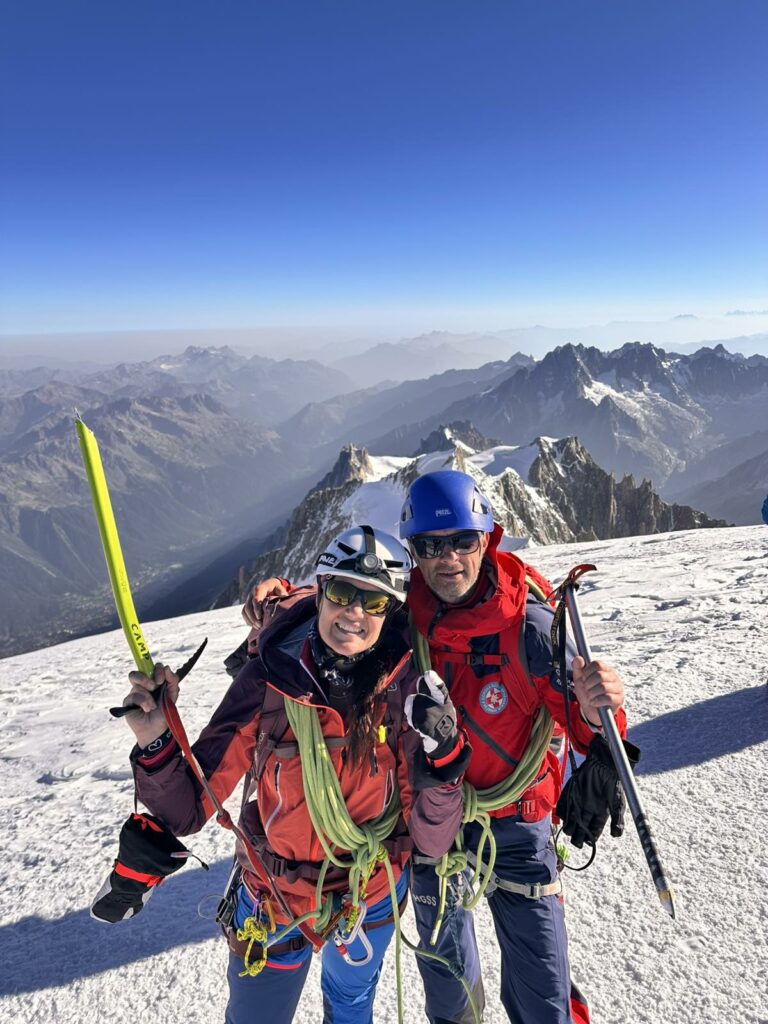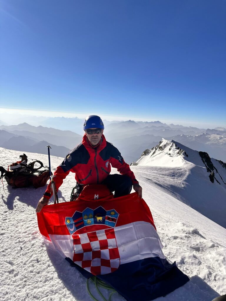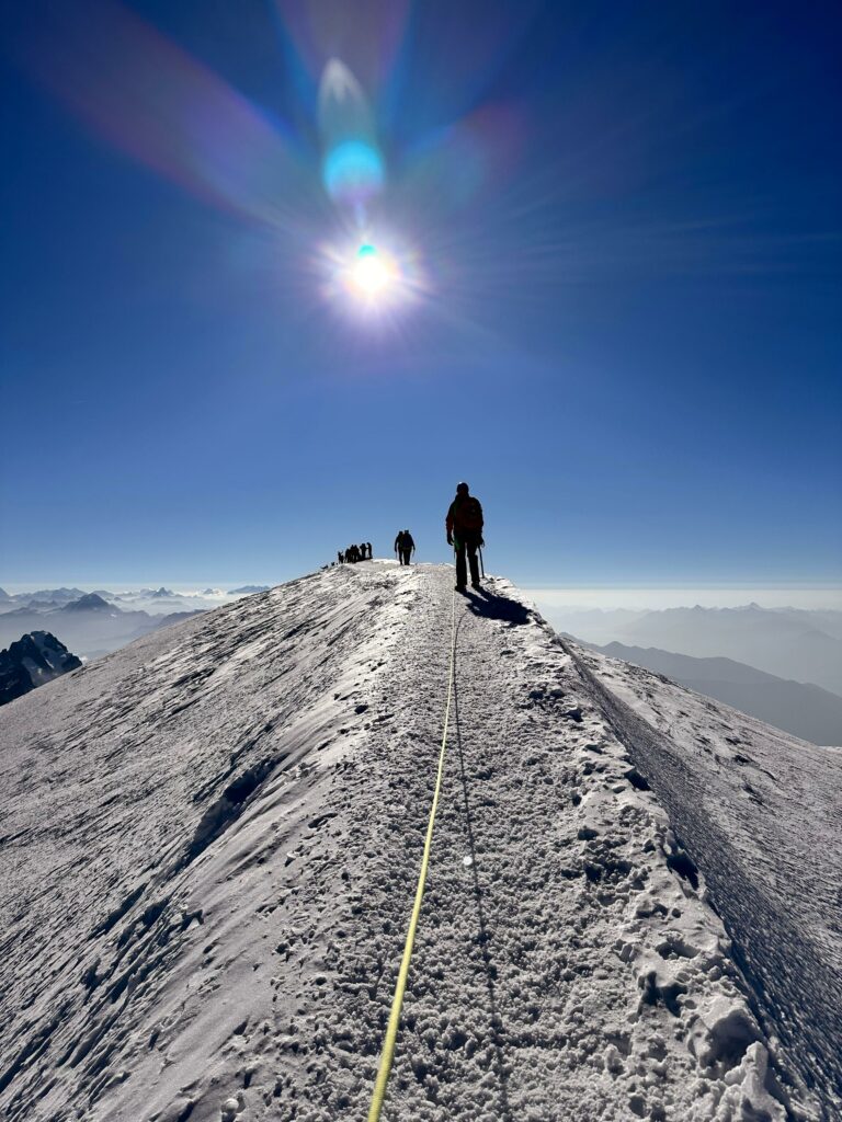 Početak uspona na vrh započinjemo nakon doručka i wc-a, cca u 3 ujutro (zbog wc-a!).  Noć je, Tomo je prvi u navezu i drži tempo. Staza je ledena, vjetar dere po licu. Čuju se samo rezovi dereza i vlastito disanje. Probijanje prvih sunčevih zraka, zora na Mont Blancu, ta toplina na licu – ludilo! Kod skloništa Vallot je napokon svanulo. Gledamo prema vrhu,  čist bez ijednog oblaka. Preko grebena Vallot po dosta opasnom grebenu Bosses tzv. Žiletu stižemo na vrh!! 4810m/nv