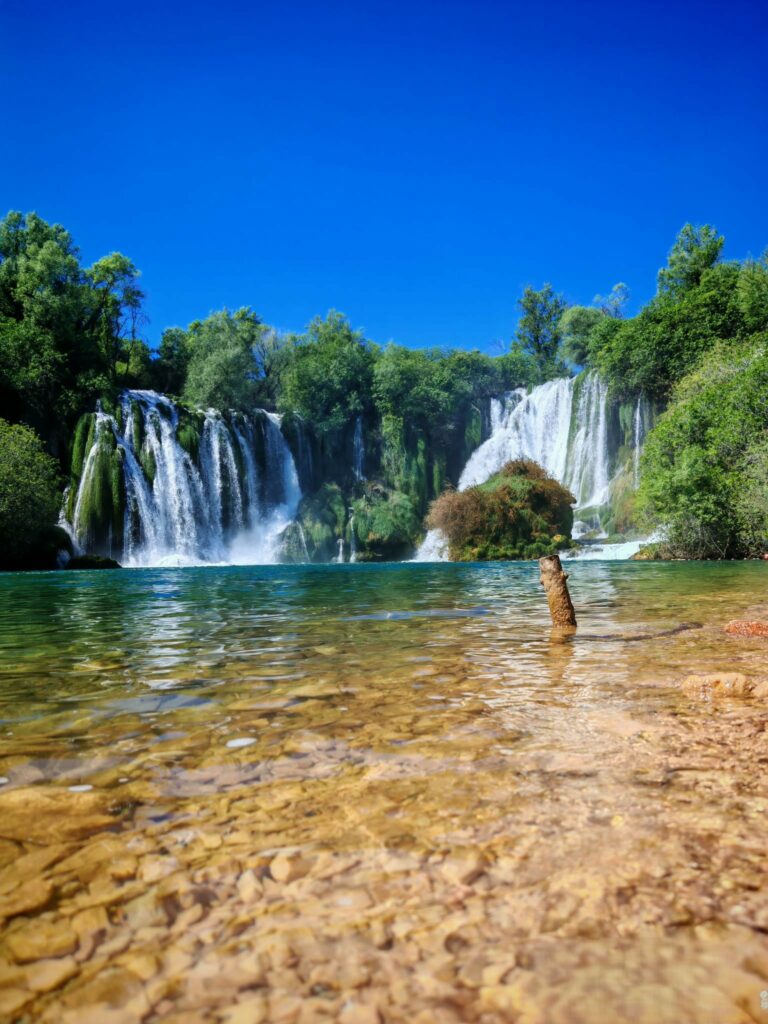 Voda se s visine od oko 26 metara obrušava u polukružno jezero, stvarajući prirodni amfiteatar okružen bujnom vegetacijom, vrbama i topolama. Tirkizna boja vode, šum slapova i svježina zraka stvaraju poseban osjećaj mira i povezanosti s prirodom. Već pri samom dolasku osjetili smo koliko je ovo mjesto posebno, buka vode, kapljice u zraku i pogled na slapove koji se šire u širinu ostavljaju snažan dojam.