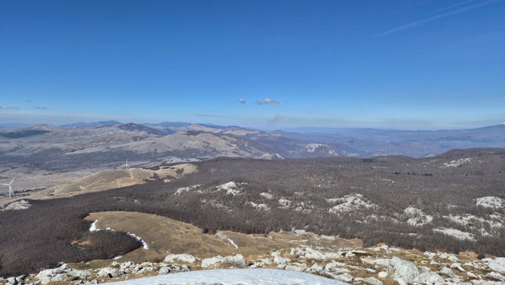 Sve nam je toplije i slijedi prva prilika za kratak odmor i skidanje slojeva odjeće. Kratak odmor omogućuje nam da poglede usmjerimo na drugu stranu, a ne samo prema usponu. Ispred nas otvara se pogled prema Velebitu, Svilaji, Dinari i njihovim vrhovima. No, nema vremena za stajanje.